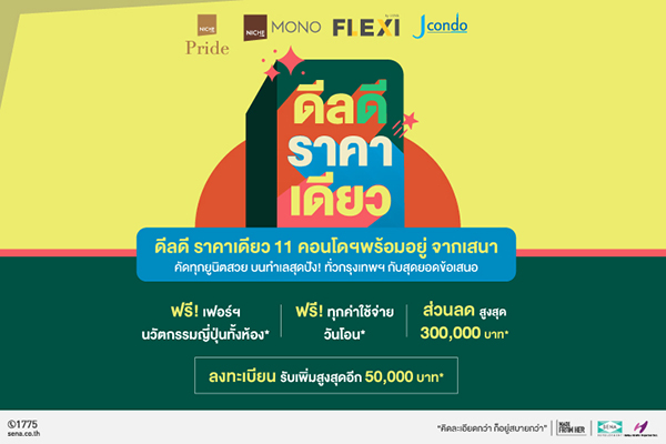 ขณะเดียวกัน ทางเสนาปล่อยโปรโมชันพิเศษ “ดีลดี ราคาเดียว” ซึ่งเป็นกลยุทธ์สำคัญเพื่อส่งเสริมการขายและช่วยกระตุ้นการตัดสินใจซื้อ พร้อมมอบความคุ้มค่าให้กับลูกค้าที่กำลังมองหาที่อยู่อาศัยทั้งราคาและเงื่อนไขที่สามารถจับต้องและเข้าถึงได้ โดยได้นำคอนโดมิเนียม 11 โครงการแบรนด์ยอดนิยมทั้ง Niche MONO , Niche Pride, Flexi สาทร และ J Condo คอนโดมิเนียมทำเลใกล้รถไฟฟ้าทั่วกรุง ระดับราคาตั้งแต่ 1.35 – 2.99 ล้านบาท