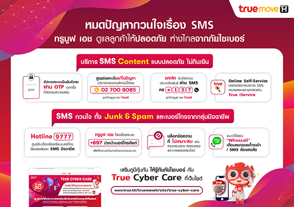 สร้างเกราะป้องกันภัยไซเบอร์แก่ลูกค้าและผู้บริโภค ผ่าน True Cyber Care ที่เว็บไซต์ www.true.th/truemoveh/site/true-cyber-care ให้ข้อมูลและแนะนำวิธีป้องกันภัยจากมิจฉาชีพรูปแบบใหม่ๆ ที่เกิดขึ้นอย่างต่อเนื่อง ไม่ว่าจะเป็นเบอร์โทร หรือ SMS หลอกลวง ปลอมแปลงเป็นผู้อื่น หรือ Phishing