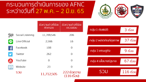 นางสาวนพวรรณ หัวใจมั่น โฆษกกระทรวงดิจิทัลเพื่อเศรษฐกิจและสังคมฝ่ายการเมือง (ดีอีเอส) กล่าวว่า ผลการมอนิเตอร์ระหว่างวันที่ 27 พ.ค.-2 มิ.ย. 65 ศูนย์ต่อต้านข่าวปลอม พบข้อความที่เข้ามา 11,712,505 ข้อความ จากการคัดกรองมีข้อความที่ต้องดำเนินการตรวจสอบ (Verify) จำนวน 222 ข้อความ รวมเรื่องที่ต้องดำเนินการตรวจสอบ 116 เรื่อง โดยสัดส่วนหลักอยู่ในกลุ่มผลิตภัณฑ์สุขภาพฯ จำนวน 67 เรื่อง