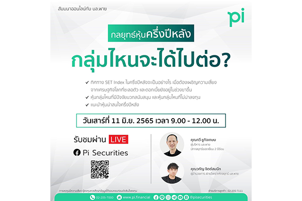 ยักษ์ลงทุน – บริษัทหลักทรัพย์ พาย จำกัด (มหาชน) หรือ “Pi” “พาย” (บล.พาย) ขอเรียนเชิญนักลงทุนและผู้สนใจ เข้าร่วมรับฟังสัมมนาผ่านช่องทาง Online ในหัวข้อ “กลยุทธ์หุ้นครึ่งปีหลัง – กลุ่มไหนจะได้ไปต่อ?” พร้อมอัพเดตเรื่องหุ้นในหัวข้อ “ทิศทาง SET Index ครึ่งปีหลังจะเป็นอย่างไรเมื่อต้องเผชิญความเสี่ยงจากเศรษฐกิจโลกที่ชะลอตัว และดอกเบี้ยยังอยู่ในช่วงขาขึ้น” , “หุ้นกลุ่มไหนที่มีปัจจัยบวกสนับสนุน และหุ้นกลุ่มไหนที่ไม่น่าลงทุน” และ “แนะนำหุ้นน่าสนใจครึ่งปีหลัง” โดยได้วิทยากรผู้มีประสบการณ์อย่าง คุณกวี ชูกิจเกษม ผู้บริหาร บล. พาย ดีกรีนักกลยุทธ์ยอดเยี่ยม 2 ปีซ้อนและคุณวทัญ จิตต์สมนึก ผู้อำนวยการฝ่ายวิเคราะห์กลยุทธ์ บล. พาย มาร่วมให้ความรู้เรื่องการลงทุนผ่านช่องทาง Online