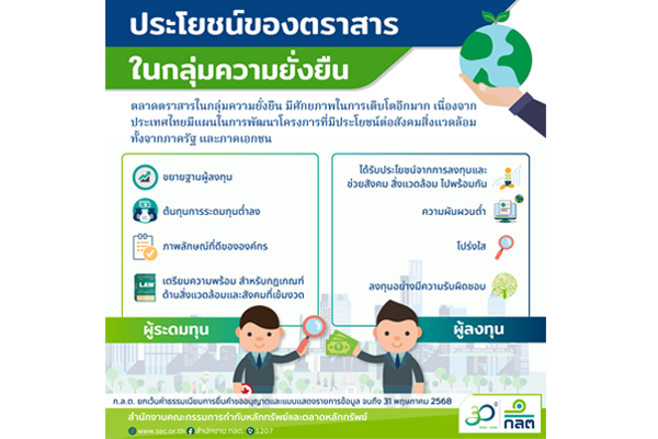 ทั้งนี้ ก.ล.ต. ขอเป็นส่วนหนึ่งในการสนับสนุนตราสารหนี้กลุ่มความยั่งยืนทุกประเภท โดยได้ยกเว้นค่าธรรมเนียมการยื่นคำขออนุญาตและแบบแสดงรายการข้อมูล จนถึง 31 พฤษภาคม 2568 เพื่อให้เกิดการลงทุนและการระดมทุนที่คำนึงถึงความยั่งยืน อันเป็นฟันเฟืองหนึ่งในการช่วยขับเคลื่อนให้เกิดการพัฒนาเศรษฐกิจและสังคมที่ยั่งยืนในระยะยาว