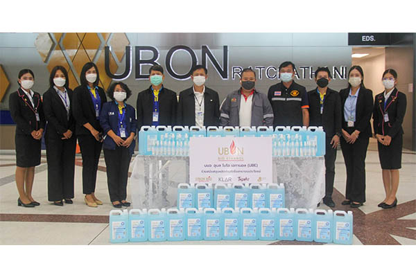 นายวุฒิพงศ์ นิลผาย รองกรรมการผู้จัดการใหญ่ ธุรกิจเอทานอล บริษัท อุบล ไบโอ เอทานอล จำกัด (มหาชน) หรือ UBE ผู้ผลิตและจำหน่ายผลิตภัณฑ์แปรรูปจากมันสำปะหลังรายใหญ่ของประเทศไทย (ที่ 5 จากขวา) มอบผลิตภัณฑ์แอลกอฮอล์ Ubon Bio ให้กับท่าอากาศยานอุบลราชธานี โดยมี ว่าที่ ร.ต. อัธยา ลาภมาก ผู้อำนวยการท่าอากาศยานอุบลราชธานี (ที่ 6 จาก ขวา) และ นายกวีศักดิ์ คูณค้ำ นักวิชาการสรรพสามิตชำนาญการพิเศษ รักษาราชการแทน สรรพสามิตพื้นที่อุบลราชธานี (ที่ 4 จาก ขวา) เป็นผู้รับมอบ ซึ่งการสนับสนุนผลิตภัณฑ์ในครั้งนี้ ประกอบด้วย เจลแอลกอฮอล์ 70% ขนาด 500 มิลลิลิตร จำนวน 10 ขวด เจลแอลกอฮอล์ 70% ขนาด 5 ลิตร จำนวน 10 แกลลอน สเปรย์แอลกอฮอล์ 70% ขนาด 100 มิลลิลิตร จำนวน 24 ขวด และ สเปรย์แอลกอฮอล์ 70% ขนาด 5 ลิตร จำนวน 20 แกลลอน เพื่อนำไปใช้ในการให้บริการแก่เจ้าหน้าที่ด่านหน้า ที่ปฏิบัติหน้าที่ให้บริการผู้โดยสาร พนักงานสายบิน ผู้ประกอบการ ร้านค้า ตลอดจนผู้โดยสาร และผู้มาใช้บริการ เสริมความแข็งแกร่งให้มาตรการป้องกันการแพร่ระบาดของโรคติดเชื้อไวรัสโควิด-19 ในพื้นที่ควบคุมสูงสุดและเข้มงวด ของท่าอากาศยานอุบลราชธานี ในการเปิดเมืองต้อนรับการท่องเที่ยว งานดังกล่าวจัดขึ้นเมื่อวันที่ 7 กรกฎาคม 2565 ที่ผ่านมา ณ ท่าอากาศยานอุบลราชธานี