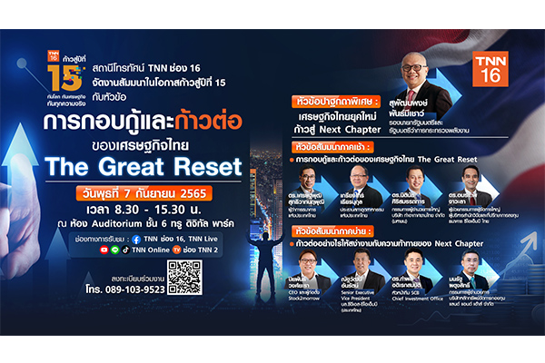 มหาวิกฤติเศรษฐกิจโลกส่งผลให้ภาคธุรกิจไทยปรับตัวอย่างไรให้เป็นผู้อยู่รอดร่วมวิเคราะห์เจาะลึกสภาวการณ์เศรษฐกิจไทยก้าวต่อไป…Next Chapter ในวาระก้าวสู่ปีที่ 15 บริษัท ไทย นิวส์ เน็ตเวิร์ค (ทีเอ็นเอ็น) จำกัด หรือ TNN ช่อง 16 เชิญชวนผู้สนใจเข้าร่วมงานสัมมนา “การกอบกู้และก้าวต่อของเศรษฐกิจไทย The Great Reset” ในวันพุธที่ 7 กันยายน 2565 โดยได้รับเกียรติจาก นายสุพัฒนพงษ์ พันธ์มีเชาว์ รองนายกรัฐมนตรีและรัฐมนตรีว่าการกระทรวงพลังงาน ขึ้นกล่าวปาฐกถาพิเศษในหัวข้อ “เศรษฐกิจไทยยุคใหม่ ก้าวสู่ Next Chapter”