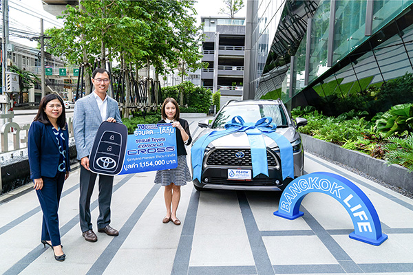 นายโชน โสภณพนิช (กลาง) กรรมการผู้จัดการใหญ่และประธานเจ้าหน้าที่บริหาร พร้อมคณะผู้บริหารจากกรุงเทพประกันชีวิต และนางสาวพรพิมล ตรงเที่ยงธรรม (ซ้าย) ผู้ช่วยผู้จัดการใหญ่ ธนาคารกรุงเทพ จำกัด (มหาชน) มอบรางวัลจากแคมเปญสุดพิเศษ “70 ปี กรุงเทพประกันชีวิต ร่วมลด…ได้ลุ้น” โดยจัดพิธีมอบรางวัลรถยนต์ Toyota Cross รุ่น Hybrid Premium Safety สี Metal Stream Metallic แก่ นางสาวเดือนเพ็ญ กัญจนวัตตะ (ขวา) ผู้โชคดี จากการทำธุรกรรมผ่านระบบออนไลน์ ซึ่งมีการจับรางวัลเมื่อวันที่ 25 สิงหาคม 2565 ที่ผ่านมา ณ บริษัท กรุงเทพประกันชีวิต จำกัด (มหาชน)