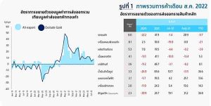 มูลค่าส่งออกเดือน ส.ค. อยู่ที่ 23,632 ล้านดอลลาร์ฯ ขยายตัว 7.5%YoY เร่งขึ้นจากเดือนก่อนหน้าที่เพิ่มขึ้น 4.3%YoY ซึ่งเป็นการขยายตัวต่อเนื่องเป็นเดือนที่ 18 จากการส่งออกสินค้าอุตสาหกรรมที่เร่งตัวขึ้นเนื่องจากปัญหาการขาดแคลนชิพเซมิคอนดักเตอร์ที่คลี่คลายลงส่งผลดีต่อการส่งออกรถยนต์ และอุปกรณ์อิเล็กทรอนิกส์ให้กลับมาขยายตัวได้ ขณะที่การส่งออกสินค้าเกษตรและอุตสาหกรรมเกษตรขยายตัวต่อเนื่องตามความต้องการสินค้าเกษตรและอาหาร รวมถึงค่าเงินบาทที่อ่อนค่าขึ้นส่งผลให้การส่งออกยังเติบโตได้ดี โดยการส่งออกในช่วง 8 เดือนแรกขยายตัว 11.0% ส่วนการส่งออกทองคำเดือนนี้กลับมาขยายตัว 16.7% ทำให้เมื่อหักทองคำแล้ว มูลค่าส่งออกเดือนนี้ขยายตัว 7.4%YoY