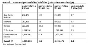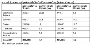 สำหรับยอดการใช้จ่ายด้านไอทีของประเทศไทยในปี 2566 คาดว่าจะสูงแตะ 934.9 พันล้านบาท เติบโตขึ้น 4.2% จากปี 2565 โดยในกลุ่มซอฟต์แวร์และกลุ่มบริการด้านไอทีจะเติบโตระดับเลขสองหลัก เนื่องจากองค์กรต่าง ๆ เพิ่มการใช้จ่ายกับโครงการดิจิทัล (ดูตารางที่ 2)