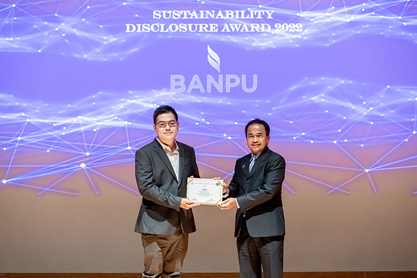 บริษัท บ้านปู จำกัด (มหาชน) (BANPU) ผู้นำด้านพลังงานที่หลากหลายในระดับนานาชาติ โดยนายจิรเมธ อัชชะ ผู้ช่วยประธานเจ้าหน้าที่บริหาร – บริหารและพัฒนาองค์กร (ขวา) เข้ารับมอบรางวัลเกียรติคุณ “Sustainability Disclosure Award” จากนายวรณัฐ เพียรธรรม ผู้อำนวยการสถาบันไทยพัฒน์ (ซ้าย) จากการประกาศรางวัลการเปิดเผยข้อมูลความยั่งยืน ประจำปี 2565 ซึ่งจัดโดยสถาบันไทยพัฒน์