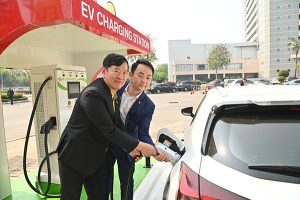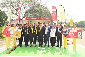 นายรังสรรค์ จันทร์นฤกุล รองกรรมการผู้จัดการใหญ่ สายงานธุรกิจลูกค้าองค์กร บริษัท โทรคมนาคมแห่งชาติ (จำกัด) มหาชน หรือ NT พร้อมด้วย นายทาคาชิ โอคาฮิระ รองประธาน บริษัท ทัทซูโน่ (ประเทศไทย) จำกัด ร่วมทำพิธีเปิดโครงการ “การสนับสนุนการให้บริการระบบเครื่องชาร์จประจุไฟฟ้า EV charger DC type” ณ บริเวณลานจอดรถด้านหลังศูนย์บริการ NT แจ้งวัฒนะ หลักสี่ กรุงเทพฯ
