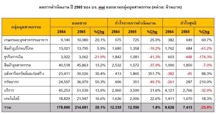 กำไรจากการดำเนินงาน 12,556 ล้านบาท เพิ่มขึ้น 1.8% และมีกำไรสุทธิรวม 7,413 ล้านบาท ลดลง 23.0% เนื่องจากในปี 2565 มีการบันทึกขาดทุนจากการด้อยค่าและการตั้งสำรองของหลาย บจ. ทั้งนี้หากไม่นับรวมรายการดังกล่าว ปี 2565 บจ. mai มีกำไรสุทธิรวมเติบโตขึ้น 6.1%