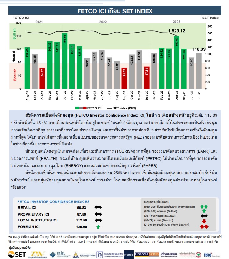 “ดัชนีความเชื่อมั่นนักลงทุน (FETCO Investor Confidence Index: ICI) ในอีก 3 เดือนข้างหน้าอยู่ที่ระดับ 110.09 ปรับตัวเพิ่มขึ้น 15.1% จากเดือนก่อนหน้า