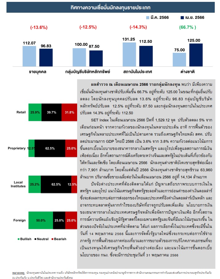 ผลสำรวจ ณ เดือนเมษายน 2566 รายกลุ่มนักลงทุนพบว่า มีเพียงความเชื่อมั่นนักลงทุนต่างชาติปรับเพิ่มขึ้น 66.7% อยู่ที่ระดับ 125.00 ในขณะที่กลุ่มอื่นปรับลดลง โดยนักลงทุนบุคคลปรับลด 13.6% อยู่ที่ระดับ 96.83 กลุ่มบัญชีบริษัทหลักทรัพย์ปรับลด 12.5% อยู่ที่ระดับ 87.50 และกลุ่มนักลงทุนสถาบันในประเทศปรับลด 14.3% อยู่ที่ระดับ 112.50
