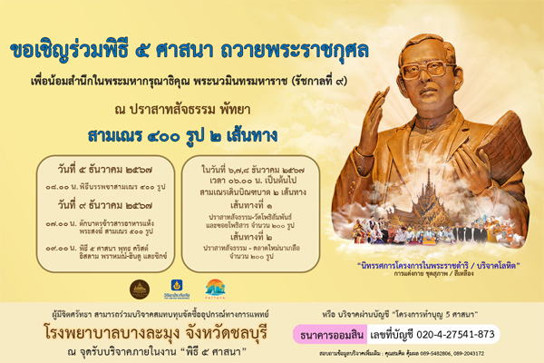 วันจันทร์ที่ 9 ธันวาคม 2567 นี้ ปราสาทสัจธรรม พัทยา ร่วมกับ บริษัท วิริยะประกันภัย จำกัด (มหาชน) และสำนักงานวัฒนธรรมจังหวัดชลบุรี กำหนดจัดงาน “พิธี 5 ศาสนา ถวายพระราชกุศล พระบาทสมเด็จพระบรมชนกาธิเบศร มหาภูมิพลอดุลยเดชมหาราช บรมนาถบพิตร”