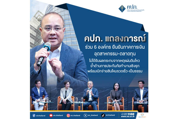 คปภ. แถลงการณ์ร่วม 6 องค์กร ยืนยันภาคการเงิน-อุตสาหกรรม-ตลาดทุน ไม่ได้รับผลกระทบจากเหตุแผ่นดินไหว ย้ำด้านการประกันภัยทำงานเชิงรุก พร้อมเบิกจ่ายสินไหมรวดเร็ว-เป็นธรรม