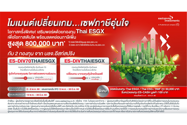 บลจ.อีสท์สปริง ตั้งThai ESGX กองผสม-กองหุ้นไทยปันผลดี ด้าน ESG เสริมพอร์ต พร้อมรับสิทธิประโยชน์ภาษี IPO 2-8 พ.ค. 68 นี้