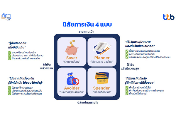 - Planner “ใช้ตามแผน มองไกล” ใช้เงินตามเป้าหมาย มองทั้งวันนี้และอนาคต พฤติกรรมเด่น เช่น ตั้งเป้าหมายทางการเงินชัดเจน ชอบจดรายรับรายจ่ายเป็นนิสัย และแบ่งเงินออม-ลงทุน-ใช้จ่าย ไว้ชัดเจน