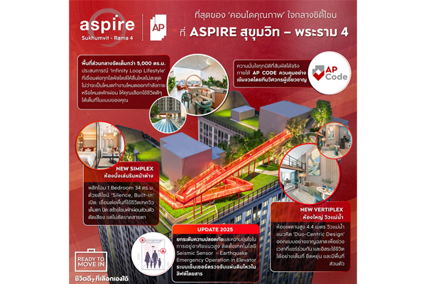 เอพี ไทยแลนด์ เผยโฉมคอนโดสร้างเสร็จพร้อมเข้าอยู่ “ASPIRE สุขุมวิท – พระราม 4” ที่สุดของคอนโดคุณภาพใจกลางซิตี้โซน สัมผัสห้องไซส์ใหญ่ 2 รูปแบบ วิวจริง คุ้มจริง SIMPLEX เริ่ม 3.79 ล้านบาท VERTIPLEX เริ่ม 5.29 ล้านบาท