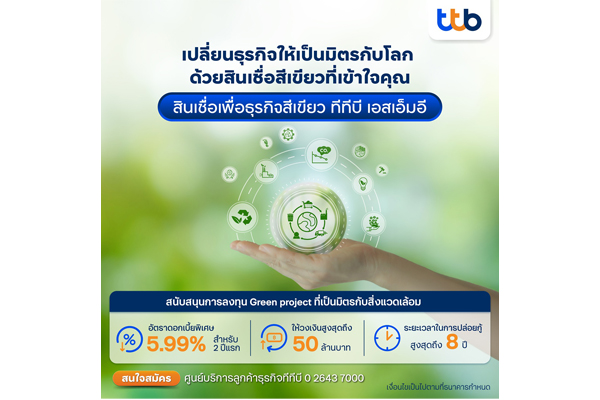 เพื่อให้ธุรกิจดำเนินตามหลักแนวคิด ESG ได้อย่างราบรื่น ต้องอาศัยพันธมิตรที่พร้อมจะก้าวไปด้วยกัน และเข้าใจความต้องการของธุรกิจ ทีทีบีพร้อมสนับสนุน SME ที่ตั้งใจปรับตัว ด้วยการให้บริการสินเชื่อเพื่อธุรกิจสีเขียว ทีทีบี เอสเอ็มอี (ttb sme green loan) ที่เข้าใจผู้ประกอบการธุรกิจ และครอบคลุมการลงทุนโครงการที่เป็นมิตรกับสิ่งแวดล้อมถึง 7 หมวดหมู่