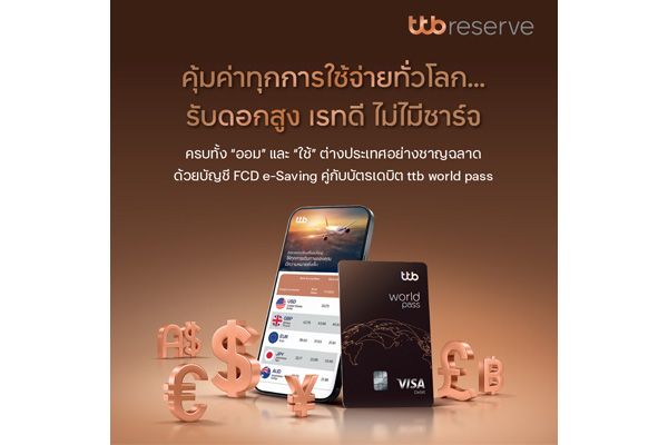 โดยเปิดตัว “ttb world pass” บัตรเดบิตที่ตอบโจทย์ทั้งการออมและการใช้จ่ายในสกุลเงินต่างประเทศอย่างชาญฉลาด ที่ถูกออกแบบมาเชื่อมต่อกับบัญชีสกุลเงินต่างประเทศ FCD e-Saving ให้ลูกค้าสามารถวางแผนทยอยแลกเก็บเงินในบัญชี FCD e-Saving ซึ่งให้ดอกเบี้ยที่สูงกว่าบัญชีเงินฝากทั่วไป
