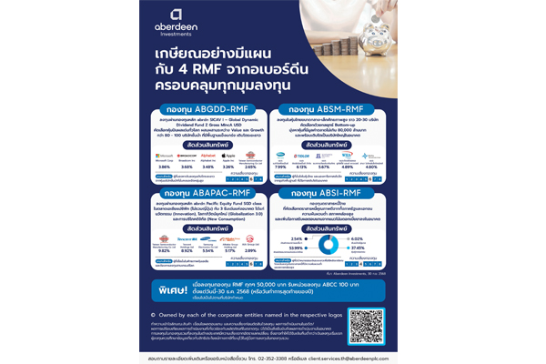 “อเบอร์ดีน” คัดกองทุน RMF ตัวเด็ด ตอบโจทย์ทุกเป้าหมายการลงทุน ชวนเกษียณอย่างมีแผนกับ “4 RMF” ครอบคลุมทุกมุมลงทุน