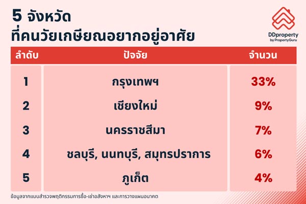 สำหรับเมืองที่ผู้บริโภคต้องการไปใช้ชีวิตหลังเกษียณมากที่สุด ได้แก่ กรุงเทพมหานคร (33%) ด้วยจุดเด่นของการเป็นเมืองหลวงที่มีความพร้อมรอบด้าน ทั้งระบบสาธารณูปโภคที่ครบครัน ตลอดจนสถานพยาบาลที่มีมาตรฐานและมีเทคโนโลยีทางการแพทย์ที่ทันสมัย จึงสามารถรองรับการดูแลสุขภาพในระยะยาวได้อย่างมั่นใจ