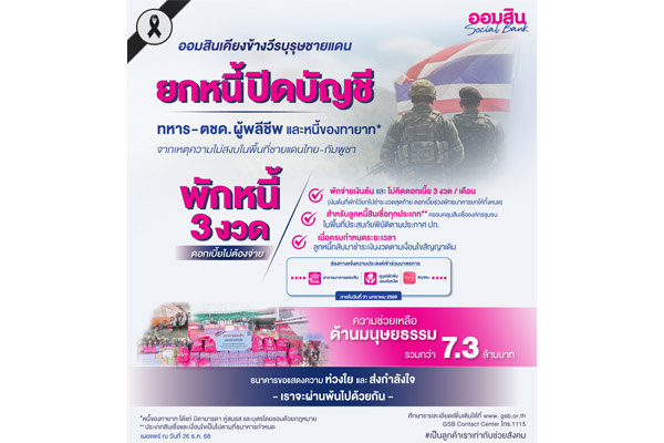 ออมสิน เคียงข้างวีรบุรุษชายแดน ประกาศ “ยกหนี้ปิดบัญชี” ทหาร – ตชด. ผู้พลีชีพ รวมถึงหนี้ของทายาท พร้อมมอบเงินเยียวยาขวัญและกำลังใจแก่ฮีโร่ผู้เสียสละ ด้านผู้อพยพประสบปัญหาขาดรายได้ ให้พักหนี้ 3 งวด – ดอกเบี้ยไม่ต้องจ่าย