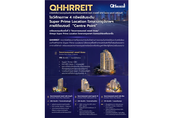 ทรัสต์เพื่อการลงทุนในอสังหาริมทรัพย์และสิทธิการเช่า ควอลิตี้ เฮ้าส์ โฮเทล แอนด์ เรซิเดนซ์ หรือ QHHRREIT (กองทรัสต์ฯ) ตอกย้ำ Hospitality REIT ชั้นนำของไทย โชว์ศักยภาพทรัพย์สินระดับท็อป 4 โครงการภายใต้แบรนด์ “Centre Point” บน Super Prime Location ทั้งประตูน้ำ สุขุมวิท สีลม และชิดลม
