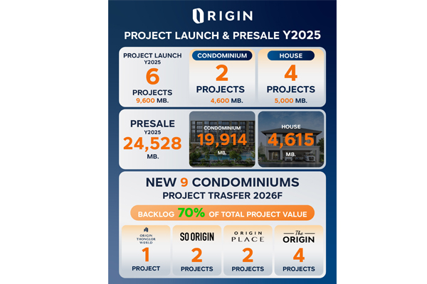 ออริจิ้น โชว์ยอดขายบ้าน-คอนโดฯ ปี 2568 กว่า 24,500 ล้านบาท ปี 2569 จ่อโอนคอนโดฯเพิ่มอีก 9 โครงการ ตุน Backlog แล้วกว่า 70% ของมูลค่าโครงการ
