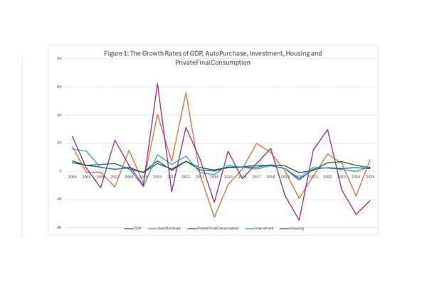 ภาวะเช่นนี้ มีส่วนสัมพันธ์กับตัวแปรเศรษฐกิจอื่น ๆ ด้วยดังแสดงใน Figure 1 การซื้อที่อยู่อาศัยกับรถยนต์มีความสัมพันธ์กันชัดเจนและมีขนาดความผันผวนสูงเหมือนกัน ตัวแปร 2 ตัวข้างต้นยังมีความสัมพันธ์กับการลงทุน ซึ่งจะส่งผลกระทบต่อไปถึงอัตราการขายตัวทางเศรษฐกิจ