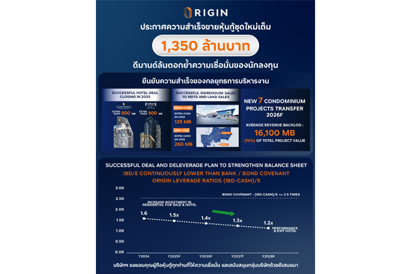 ออริจิ้น พร็อพเพอร์ตี้ ประกาศความสำเร็จขายหุ้นกู้ชุดใหม่ครั้งที่ 1/2569 ตามเป้าหมาย นักลงทุนจองซื้อทะลุเต็มจำนวน 1,350 ล้านบาท ตอกย้ำความเชื่อมั่นในธุรกิจ
