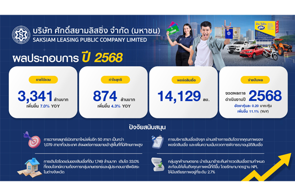 บมจ.ศักดิ์สยามลิสซิ่ง หรือ SAK ผู้ให้บริการสินเชื่อรายย่อย โชว์ความสำเร็จก้าวข้ามผ่านความท้าทายปี 2568 ผลงานสุดแกร่ง ทำรายได้รวม 3,341 ล้านบาท เติบโต 7.0% มีกำไรสุทธิ 874 ล้านบาท เติบโต 4.3% เมื่อเทียบกับปีก่อน
