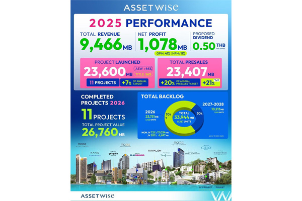 ทั้งนี้ ASW มียอดรอรับรู้รายได้ (Backlog) ณ สิ้นปี 2568 มูลค่าทั้งสิ้น 33,944 ล้านบาท ซึ่งจะทยอยโอนกรรมสิทธิ์เป็นรายได้เข้าสู่บริษัทตั้งแต่ปีนี้ต่อเนื่องไปจนถึงปี 2571