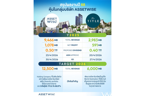 นายกรมเชษฐ์ วิพันธ์พงษ์ ประธานเจ้าหน้าที่บริหาร บริษัท แอสเซทไวส์ จำกัด (มหาชน) หรือ ASW กล่าวว่า ASW สามารถสร้างผลการดำเนินงานปี 2568 ได้อย่างมีประสิทธิภาพ โดยมียอดขายทั้งปี 23,407 ล้านบาท เติบโตจากปีก่อน 21% ขณะที่รายได้รวมอยู่ที่ 9,466 ล้านบาท และมีกำไรสุทธิ 1,078 ล้านบาท