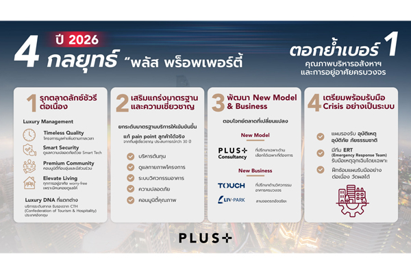 พลัส พร็อพเพอร์ตี้ ในเครือแสนสิริ ตอกย้ำเบอร์หนึ่ง Property Management  คุณภาพของไทย กางกลยุทธ์ปี 2569 ดัน ‘Luxury Management’ เจาะตลาดพรีเมียม พร้อมยกระดับมาตรฐานบริการและความใส่ใจดูแลลูกค้า ซึ่งเป็น DNA ที่แข็งแกร่ง ตั้งเป้าดันรายได้สู่ 2,100 ล้านบาท ก้าวสู่ปีที่ 30 อย่างมั่นคง