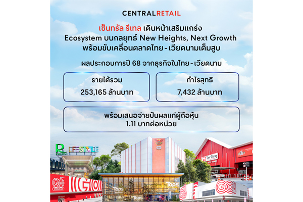 เซ็นทรัล รีเทล ปิดไตรมาส 4 ด้วยกำไรสุทธิหลังรายการปรับปรุงโต 17% จากไทย-เวียดนาม และ รายงานผลประกอบการปี 2568 ด้วยรายได้ 253,165 ล้านบาท กำไรสุทธิหลังรายการปรับปรุง 7,432 ล้านบาท