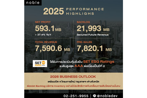 บริษัท โนเบิล ดีเวลลอปเมนท์ จำกัด (มหาชน) หรือ “NOBLE” ผู้นำด้านการพัฒนาโครงการที่อยู่อาศัยในทำเลศักยภาพของกรุงเทพมหานครและปริมณฑล ประกาศผลการดำเนินงานปี 2568 ด้วยกำไรสุทธิ 593.1 ล้านบาท เพิ่มขึ้นร้อยละ 37.4 จากปีก่อนหน้า