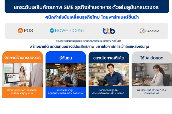 ทีทีบี ผนึกกำลังกับ LINE MAN Wongnai ร่วมกับ FlowAccount และ Skooldio พัฒนาโซลูชันดิจิทัลครบวงจรสำหรับธุรกิจร้านอาหารไทย เชื่อมโยงทุกระบบตั้งแต่การขายหน้าร้าน หลังบ้าน บัญชี การเงิน ไปจนถึงการเสริมทักษะดิจิทัล ช่วยให้เจ้าของร้านมองเห็นภาพรวมธุรกิจ คุมต้นทุนและบริหารการเงินได้อย่างแม่นยำ พร้อมผลักดันการเติบโตอย่างยั่งยืน
