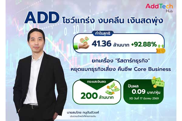 ADD โชว์สถานะแกร่ง งบคลีน เงินสดพุ่ง เสิร์ฟปันผล 0.09 บาทต่อหุ้น พร้อม XD 17 มี.ค. นี้ ประกาศ “รีสตาร์ทธุรกิจ” หยุดแบกธุรกิจเสี่ยง คืนชีพ Core Business