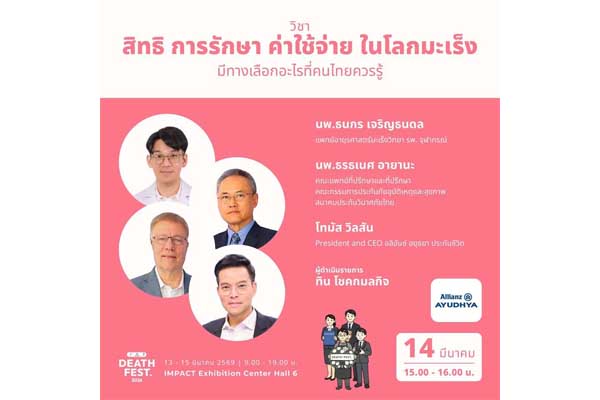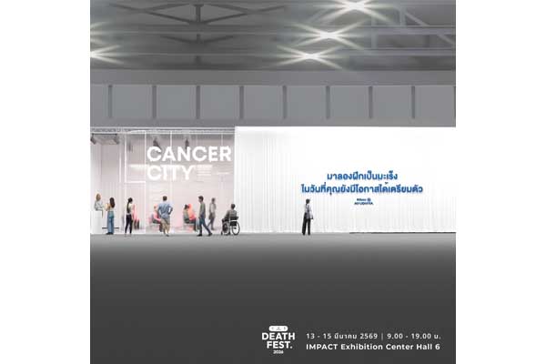 ภายในงาน Death Fest 2026 ซึ่งจะจัดขึ้นระหว่างวันที่ 13 –15 มีนาคม 2569 เวลา 09.00 – 19.00 น. ณ IMPACT Exhibition Center Hall 6 เพื่อเปิดมุมมองเกี่ยวกับโรคมะเร็ง และส่งเสริมให้สังคมตระหนักถึงความสำคัญของการเตรียมความพร้อมด้านสุขภาพและการวางแผนชีวิต