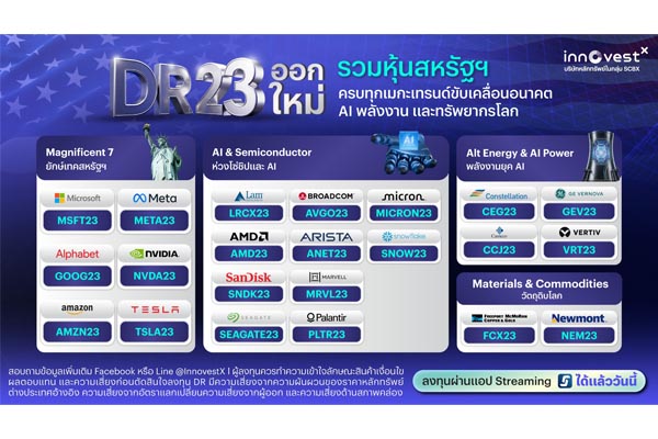 InnovestX รุกตลาด DR ต่อเนื่อง ส่ง DR23 ชุดใหม่ เสริมพอร์ตหุ้นสหรัฐฯ ผู้นำ เทคโนโลยีโลก ต่อยอดโอกาสจาก AI และเศรษฐกิจดิจิทัล