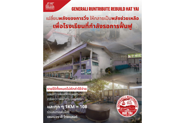 เจนเนอราลี่ ไทยแลนด์ ขอเชิญชวนประชาชนและผู้รักสุขภาพ ร่วมเป็นส่วนหนึ่งของพลังแห่งการให้ในกิจกรรม “GENERALI RUNTRIBUTE: REBUILD HAT YAI” งานวิ่งการกุศลที่จัดขึ้นเพื่อรวมพลังของนักวิ่งและคนไทยทุกคน