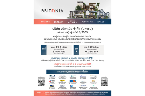 ก.ล.ต. อนุมัติ “บริทาเนีย (BRI)” เสนอขายหุ้นกู้ชุดใหม่ครั้งที่ 1/2569 ช่วง 5 – 7 พฤษภาคม 2569 รวมมูลค่า 1,300 ล้านบาท เป็นหุ้นกู้ประเภทมีหลักประกันจำนวน 2 ชุด จ่ายดอกเบี้ยทุก 3 เดือน ผลตอบแทนดอกเบี้ยสูงสุด 6.05% เปิดให้ผู้ลงทุนทั่วไป และ/หรือ ผู้ลงทุนสถาบัน จองซื้อผ่านสถาบันการเงินหลัก 15 สถาบัน