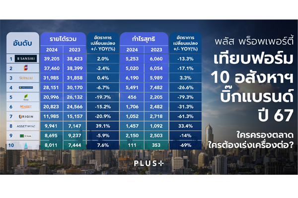 พลัส พร็อพเพอร์ตี้ เทียบฟอร์ม 10 อสังหาฯ บิ๊กแบรนด์ ปี 67 ใครครองตลาด ใครต้องเร่งเครื่องต่อ?