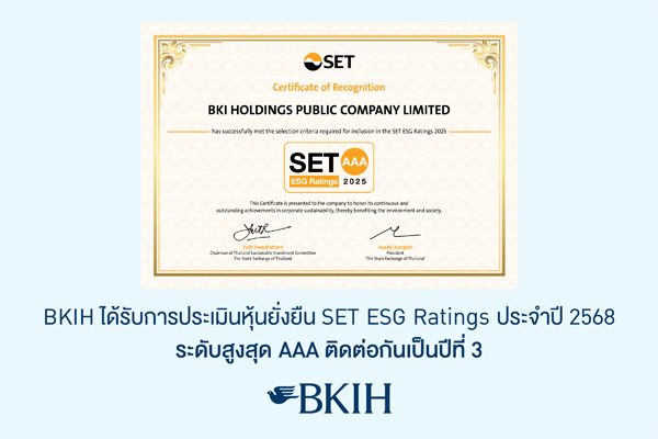 BKIH คว้าหุ้นยั่งยืน SET ESG Ratings ประจำปี 2568 ระดับสูงสุด AAA ติดต่อกัน 3 ปีซ้อน ตอกย้ำการดำเนินธุรกิจที่ยั่งยืนอย่างต่อเนื่อง บริษัท บีเคไอ โฮลดิ้งส์ จำกัด