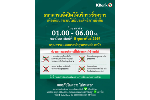 กสิกรไทยแจ้งปิดปรับปรุงระบบชั่วคราว ช่วง 01:00 – 06:00 น. ของวันที่ 8 ก.พ. 69