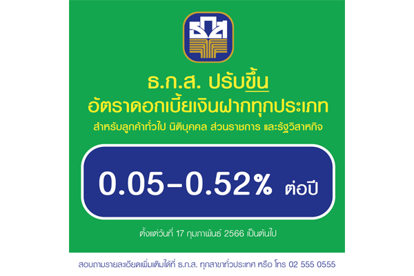 ธ.ก.ส. ปรับขึ้นดอกเบี้ยเงินฝากสูงสุดร้อยละ 0.52 ตั้งแต่ 17 ก.พ. 66 เป็นต้นไป