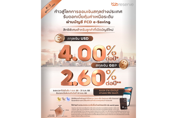 ทีทีบี ชวนเปิดบัญชีออมเงินสกุลต่างประเทศ USD และ GBP
