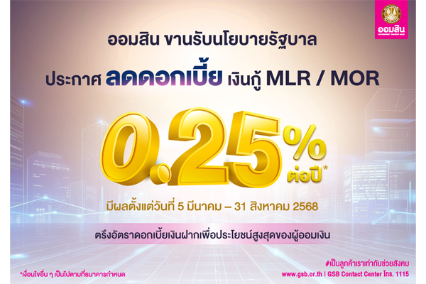 ออมสิน ประกาศลดดอกเบี้ยเงินกู้ MLR / MOR 0.25% ขานรับนโยบายรัฐช่วยภาคธุรกิจ พร้อมตรึงดอกเบี้ยเงินฝากเพื่อประโยชน์สูงสุดของผู้ออมเงิน