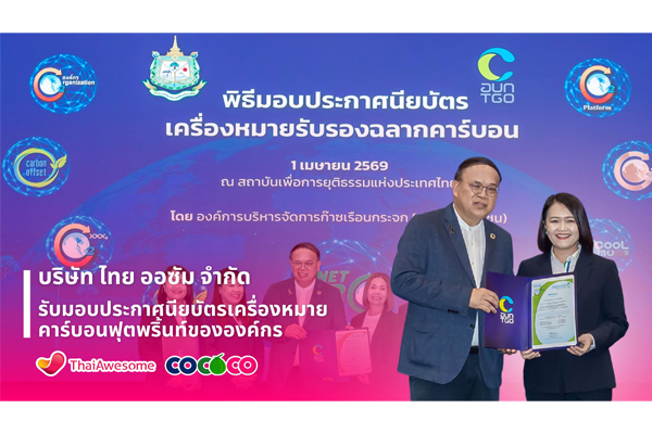 ไทย ออซัม คว้าประกาศนียบัตรเครื่องหมายคาร์บอนฟุตพริ้นท์องค์กร