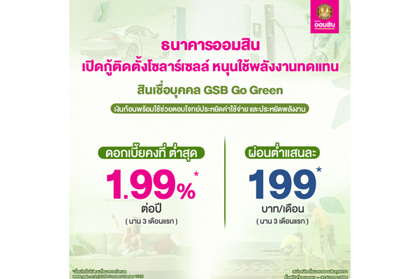 ออมสิน เปิดให้กู้ติดตั้งหลังคาโซลาร์เซลล์ ดอกเบี้ยคงที่ต่ำสุด 1.99%
